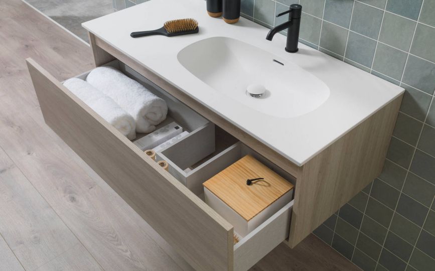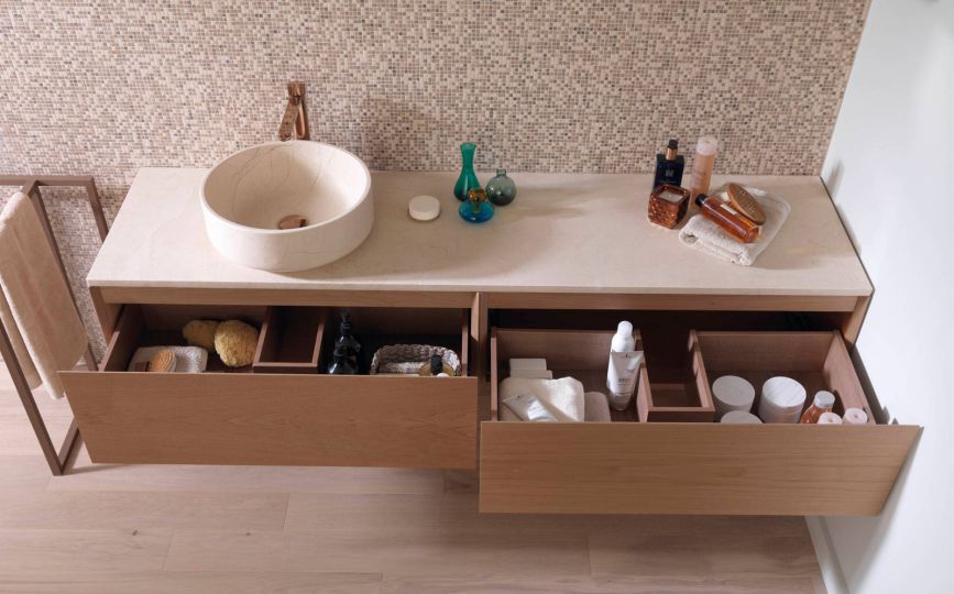 Cabinetry suspended or raised a few centimeters from the ground and with internal organizers or drawers optimize possibilities for bathrooms and expand their capacity