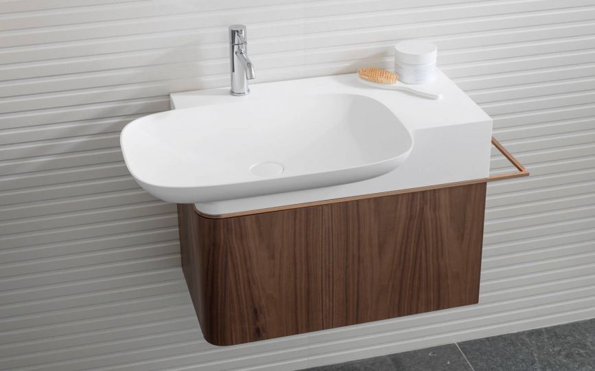 Using materials such as wood, glass, and KRION®, this bathroom cabinetry allows for spaces to be organized in a balanced way